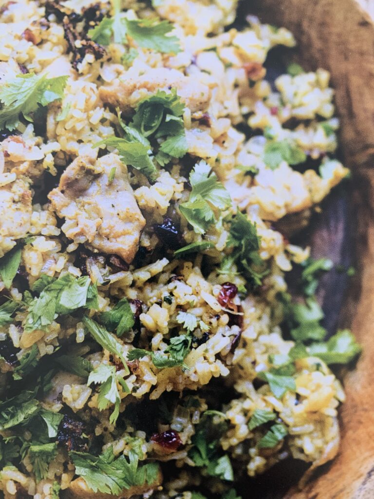 - Add the cooked rice, dried cranberries, and 1/2 cup coconut water to the skillet.