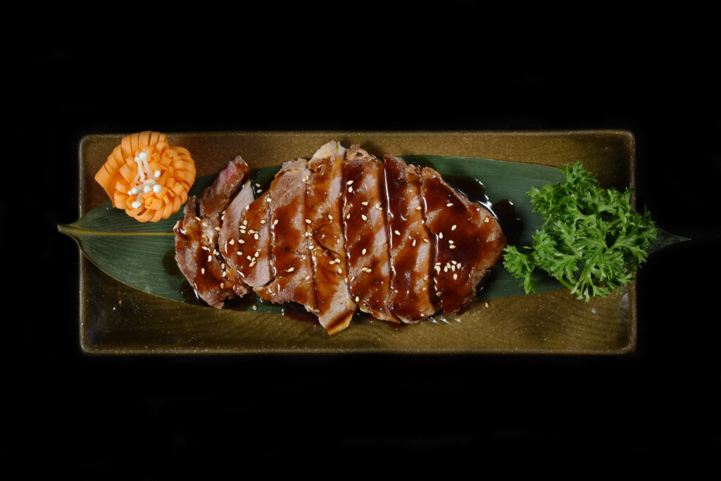 - Spoon the teriyaki sauce over the steak and vegetables.
